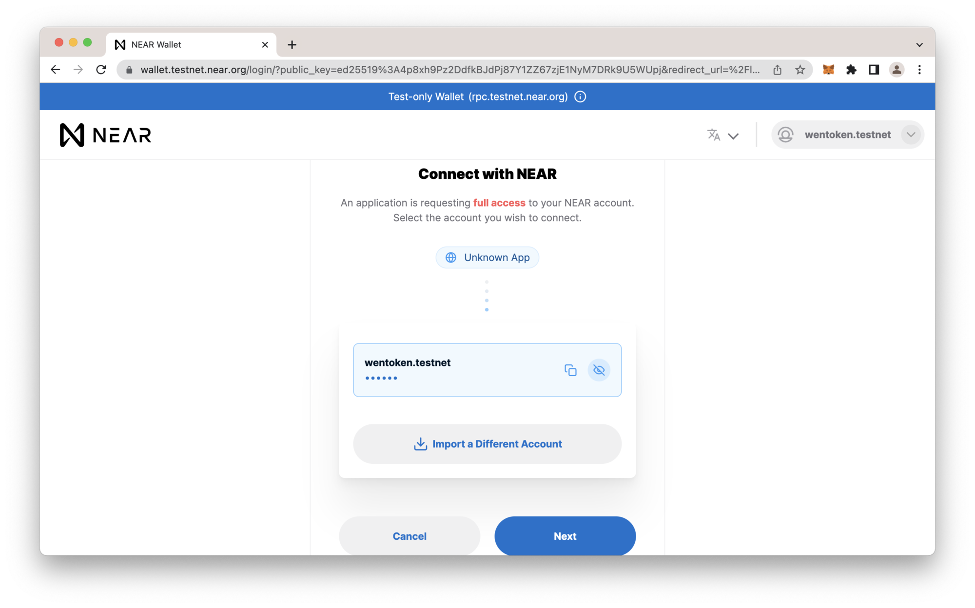 接下来,运行以下命令以转发到 NEAR Wallet 页面,你将在其中授予对 near-cli 的访问权限。