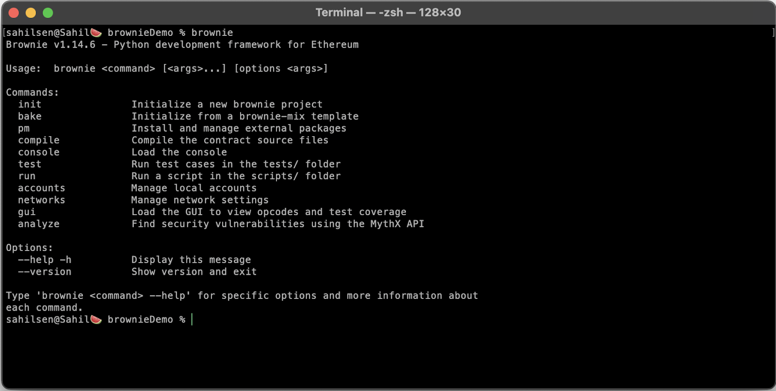 要检查 Brownie 是否正确安装,请在你的终端/cmd 中输入 brownie,它应该给出以下输出: