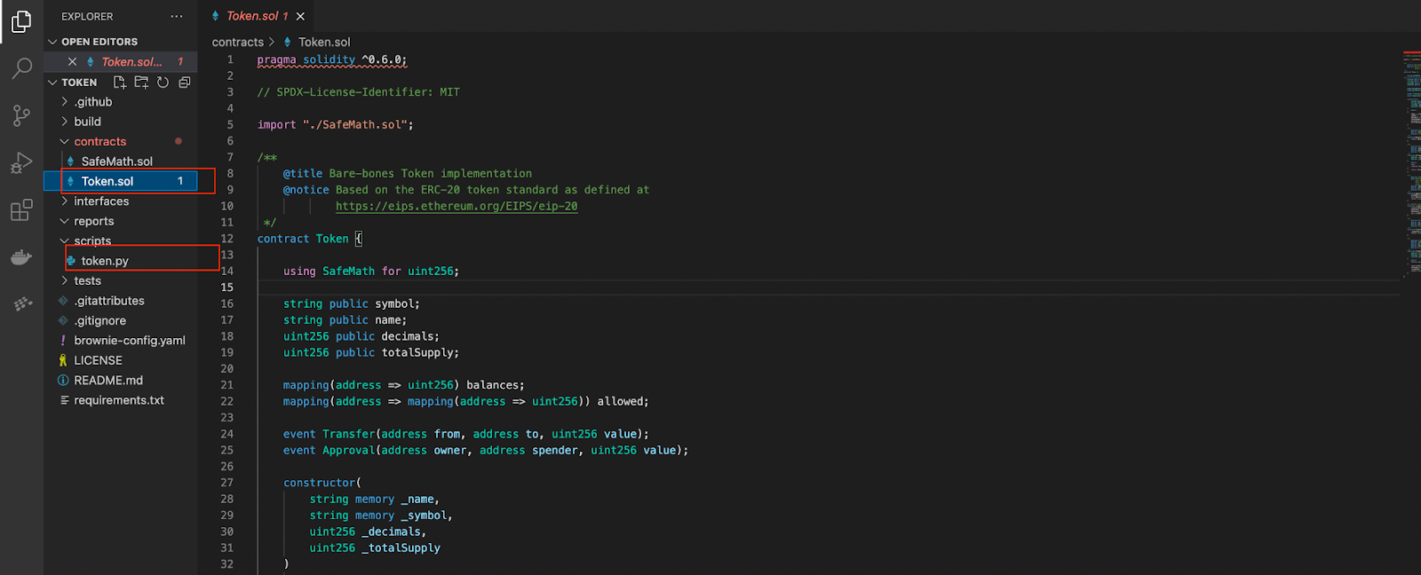 现在,在你的文本编辑器中打开 token 目录。在 contracts/ 文件夹下,你会发现 Token.sol,这是我们的主要合约;你可以编写自己的合约或修改此合约。在 scripts/ 文件夹下,你会找到 token.py python 脚本;此脚本将用于部署合约,并且需要根据合约进行修改。