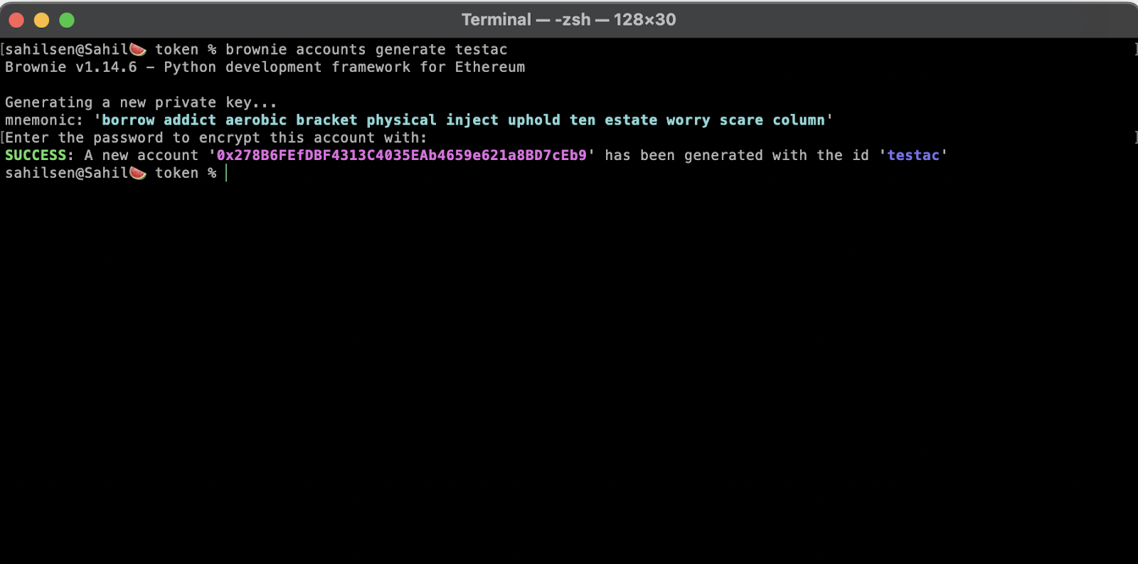 我们在这里需要做的下一件事是使用 Brownie 创建一个新钱包。为此,请在你的终端/cmd 中输入以下内容。系统会要求你为你的帐户设置密码。