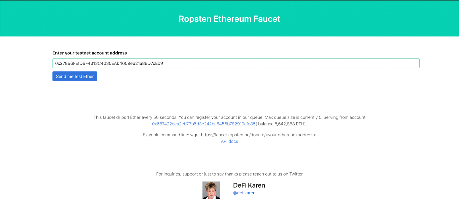由于我们的合约将部署在 Ropsten 测试网上,因此我们将需要一些 Ropsten 测试 ETH 来支付 gas 费用。前往 Ropsten faucet,将你的地址粘贴到该字段中,然后点击“Send me test Ether”。