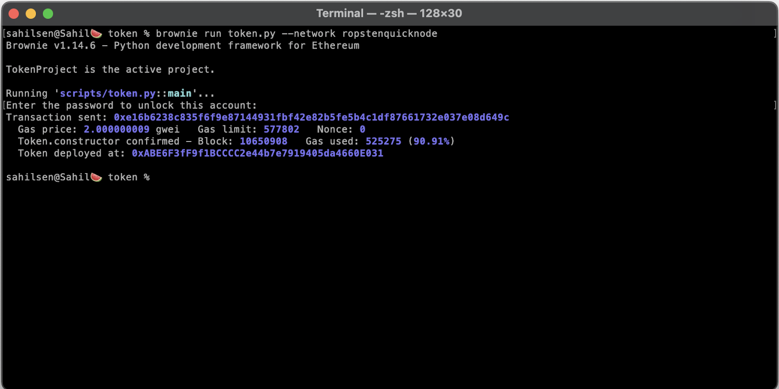 brownie run token.py --network ropstenquicknode