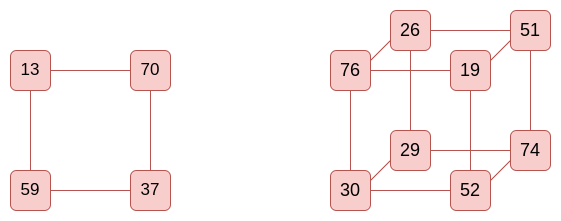 本质上,你进行许多轮交替的操作,包括将整个数据乘以一个矩阵,以及将每个元素立方并加上一个常数。中间的回合是“部分回合”,其中两个操作都被简化:矩阵是一个“简单”的矩阵(上图中的 diag+J),可以评估为 xi→xi∗di+sum(x0,x1...x15),并且只有第一个值被立方。这种完整回合和部分回合的组合被认为是性能和安全性之间权衡的最佳选择,但这对于构造而言并非必不可少:如果你愿意,你可以只使用具有随机矩阵的完整回合。