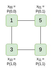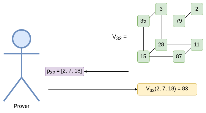 此处的 W31 是与“在 p32 处评估”相对应的“权重”。多线性多项式的任何评估都可以由权重表示。例如,考虑具有评估 [[1, 5], [3, 9]] 的 2D 多线性多项式: