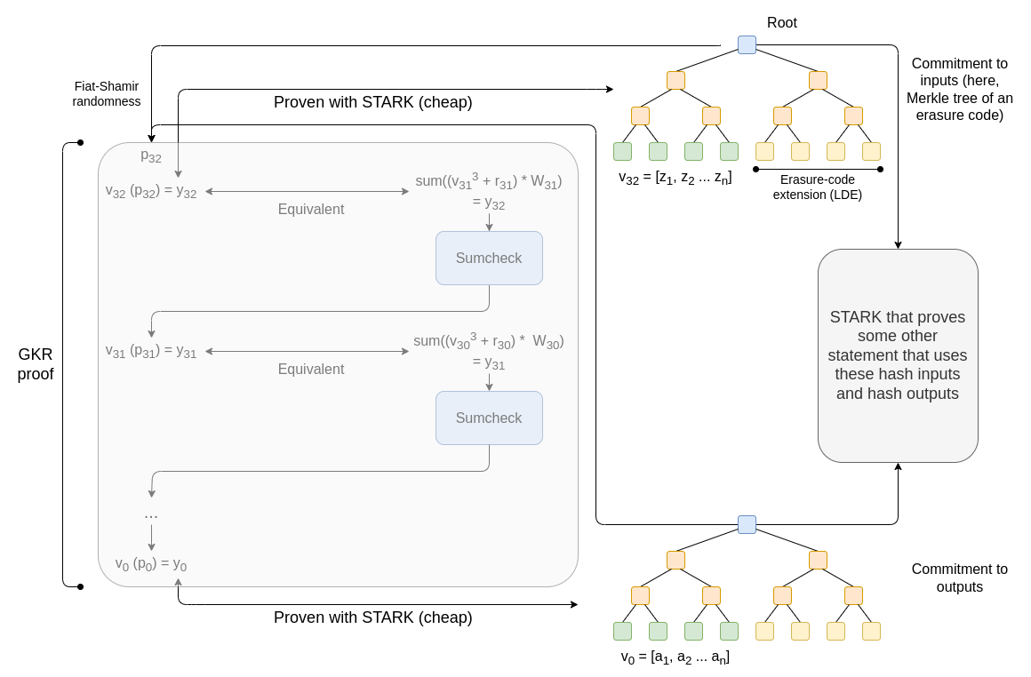 一个重要的安全考虑因素是 2025 年的一项观察:如果被证明的电路也可以在其自身的深度内足够快地计算用于导出挑战的 Fiat-Shamir 哈希,则恶意 prover 可能会预测挑战,从而欺骗证明系统。这对于像上面示例中那样使用 GKR 来证明哈希没有问题,因为 (i) 该方案是围绕一个固定电路设计的,该电路不会为攻击者利用这些技巧创造空间,并且 (ii) 该攻击涉及向 GKR 提供一个在内部计算哈希和其他计算的电路,因此根据定义,一个纯哈希电路中没有足够的深度来执行它。但是,对于更复杂和通用的 GKR 用例来说,这是一个问题;一种缓解措施是调整用于计算 Fiat-Shamir 挑战的哈希,使其需要比电路具有的回合数更多的回合来计算。