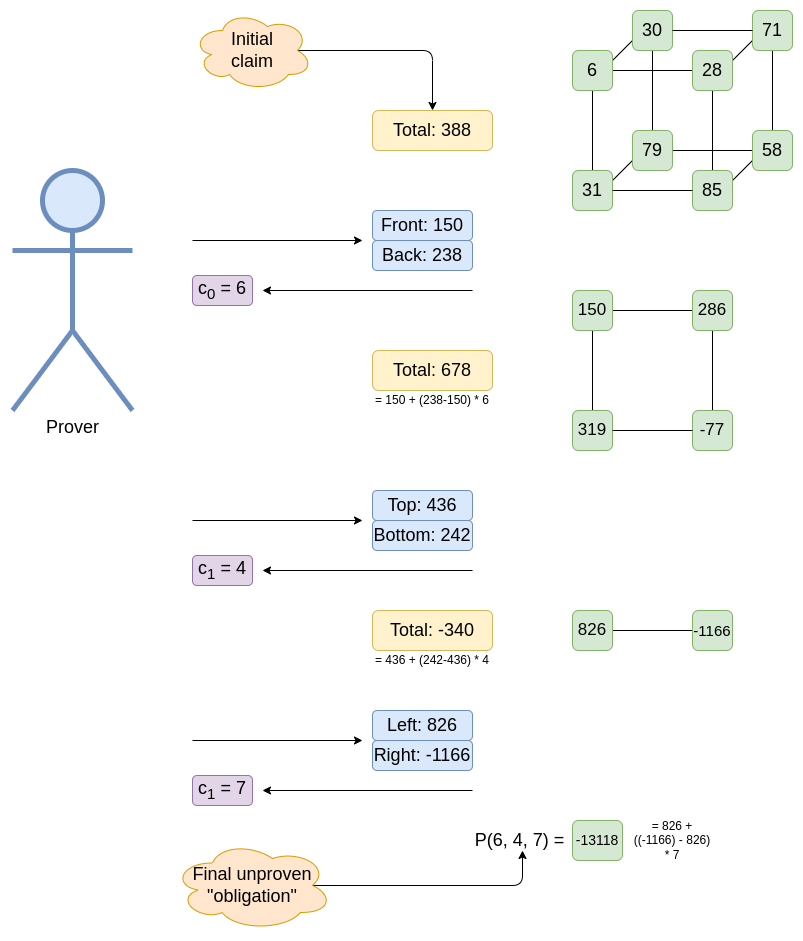 这是一个标准的“随机线性组合”技巧:通过证明线性声明(在本例中为总和)对于这些值的随机线性组合是正确的,来证明该声明(在本例中为超立方体的两个一半)对于多个值(此处)是正确的。在 bulletproof 中也使用了类似的想法。并且像在 bulletproofs 中一样,我们递归地使用随机线性组合技巧:prover 继续将关于超立方体的声明转换为关于一半大小的超立方体的声明,直到“超立方体”缩小为一个单一值。该值是原始多元多项式在随机点(此处为 (6, 4, 7))处的评估。如果 prover 可以证明该评估,那么他们就证明了原始总和。