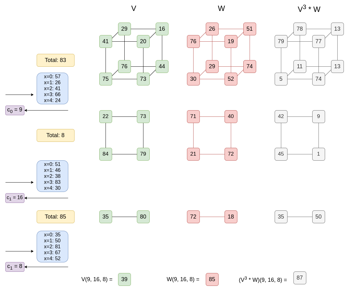 你可以对 W 的线性组合执行相同的操作:给定总和 hsumx=sum(V313(x,...)∗Whalf(...)),你可以将其乘以 x∗c+(1−x)∗(1−c) 以获得“真实总和”sumx=sum(V313(x,...)∗W31(x,...))。