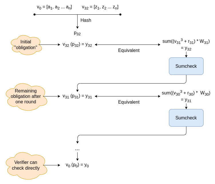 然后,我们继续并继续进行,直到获得声明 V0(p0)=y0。因为 V0 只是输入,并且 verifier 具有输入,所以 verifier 可以直接检查。让我们以图表形式回顾整个流程: