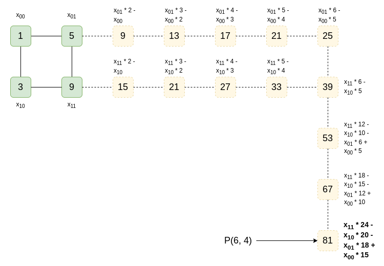 现在,假设我们想要在 (4, 6) 处进行评估。我们可以计算它!一种简单的方法是沿着水平或垂直线取差值(例如 x01−x00),并一遍又一遍地重新应用它以“扩展”该线: