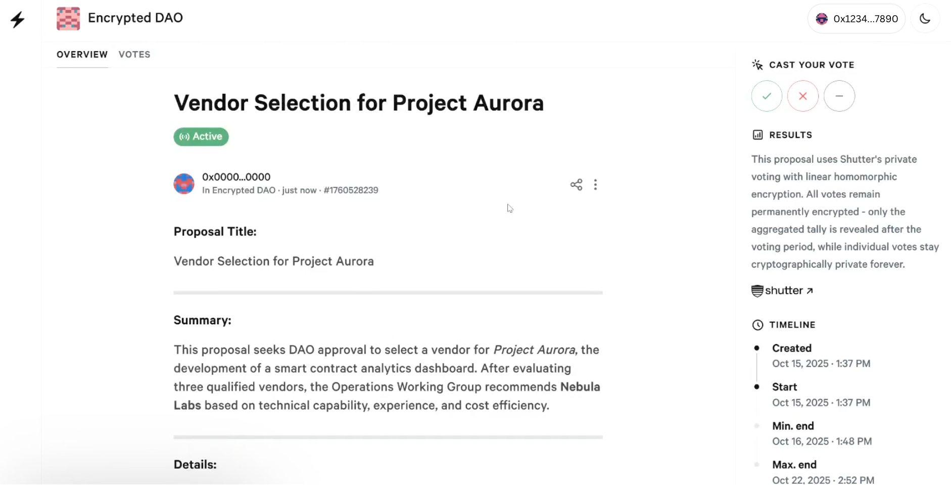 在这个 PoC 中,用户可以使用 Shutter 基于 El-Gamal 的系统私下投赞成/反对票。通过将多项选择和其他高级投票类型拆分为多个二元子投票,也是可行的。