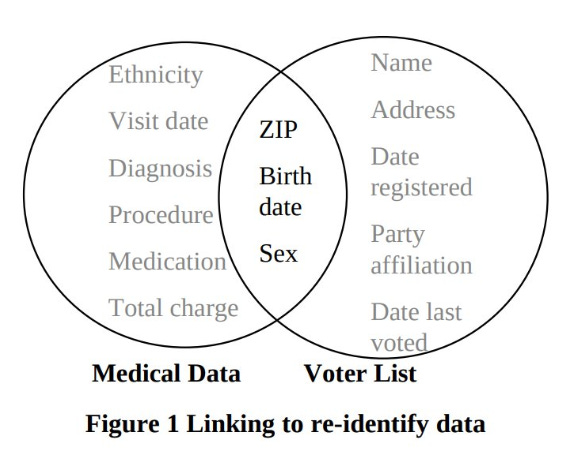该论文中的下图对于任何花时间学习 SQL 中什么是“内连接”的人来说,可能看起来很熟悉。它说明了一个不同的例子,其中 Sweeney 使用相同的字段将医疗记录链接到选民登记列表,从而确定了时任马萨诸塞州州长 William Weld 在“匿名化”医疗数据集中的特定记录: