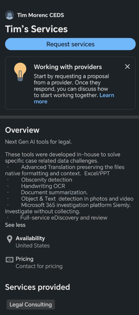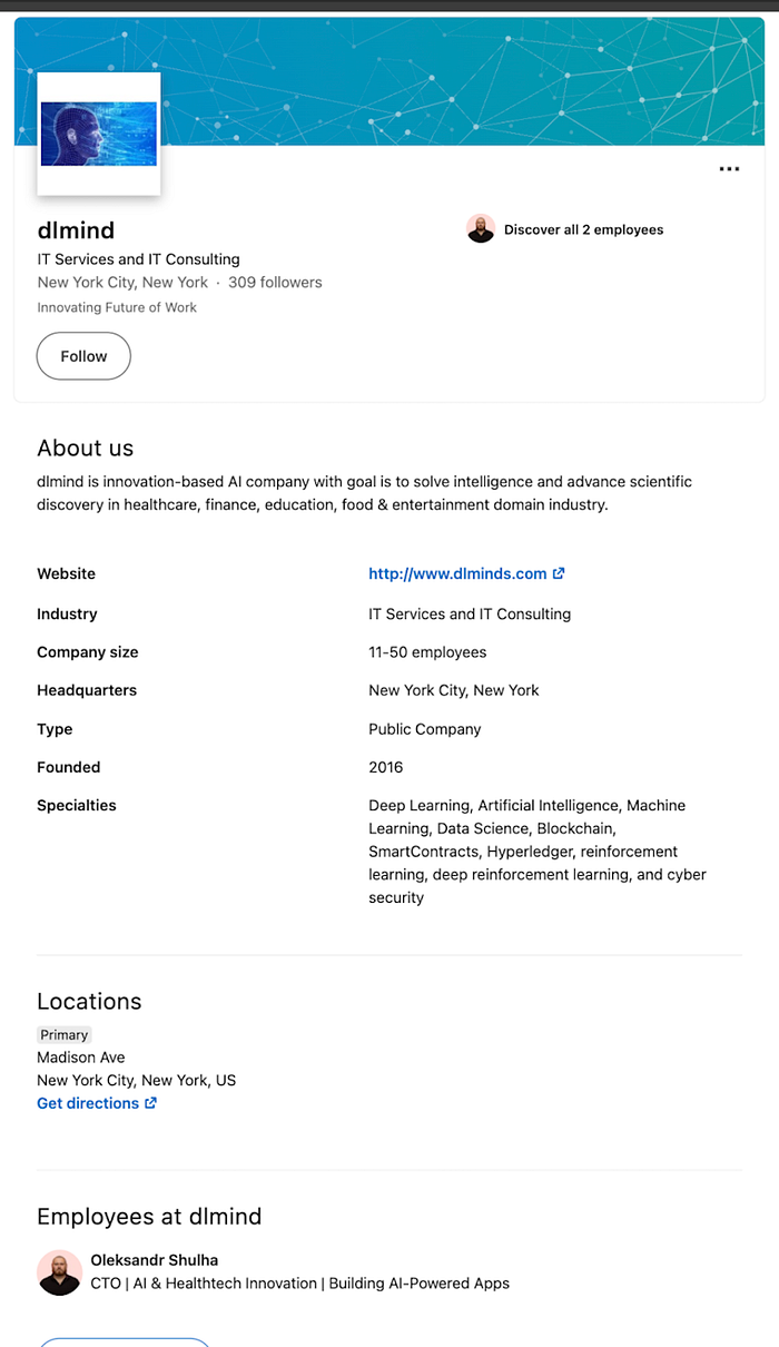 这家公司看起来很令人兴奋 - DLMind,一个“AI驱动的创新实验室”。招聘人员似乎很靠谱 - Tim Morenc, CEDS,拥有完善的LinkedIn个人资料、专业的语气以及共同联系人的历史。