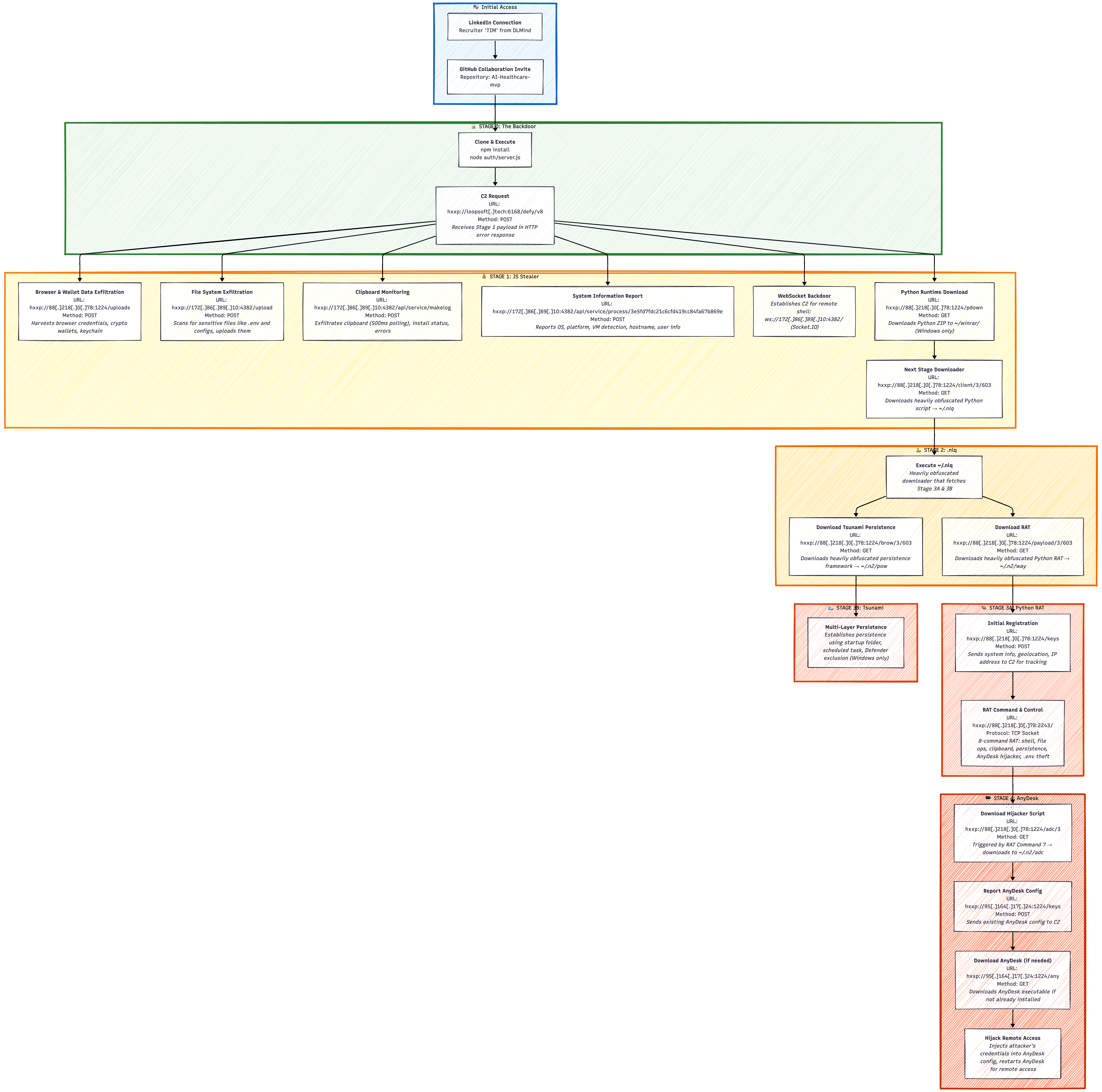 一旦提供的脚本执行,它就会展开一个五阶段的 payload - 一个精心设计的攻击链,旨在融入开发者的工作流程。