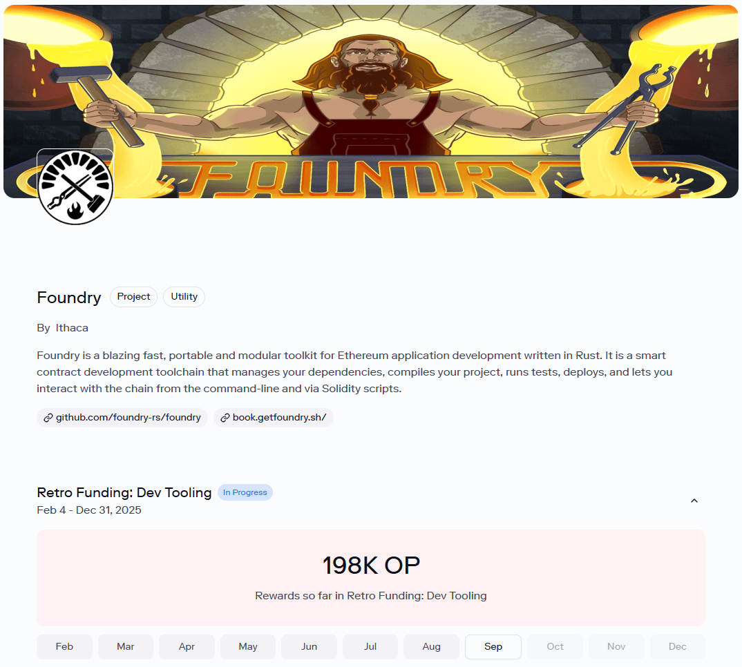 • Foundry:以太坊开发工具箱,因其被 Balancer、Velodrome 等顶级项目采用,已获得近 20 万OP 的巨额奖励。