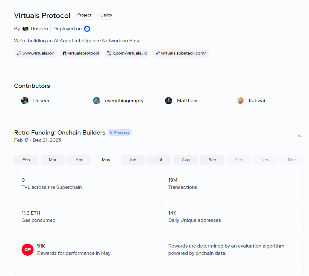 • Virtuals Protocol:一个 AI 代理网络,凭借 1900 万美元 TVL 1900 万次交易等亮眼数据,已斩获超 22.7 万 OP 奖励。