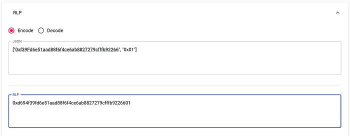 这将显示该地址的 nonce。现在让我们使用上面的计算公式。让我们进行 RLP 编码。你可以从之前的博客中获取 RLP 编码的代码,或者使用一些在线工具。为了清晰起见,我将使用在线工具。