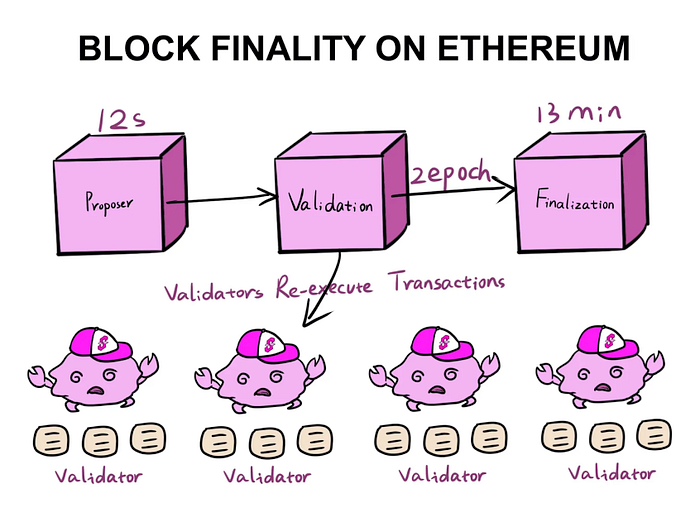 目前,Ethereum 将一个 Epoch 定义为 32 个区块(Slots)的捆绑,并且只有在两个 Epochs 过去后,一个区块才会被最终确定。这意味着大约需要 13 分钟(32 个 slots 12 秒/slot 2 个 epochs ~ 12.8 分钟)才能最终确认单个交易。
