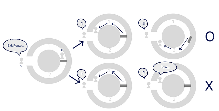 为此,V 站在洞穴入口处,P 进入洞穴并选择路径 1 或路径 2(超出 V 的视线)。之后,V 随机命令,“从路径1出来”或“从路径2出来”。