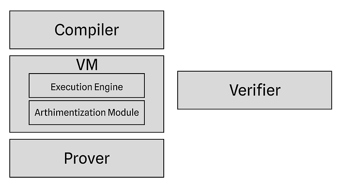 通过 zkVM 生成 ZKP 的过程涉及虚拟机、编译器和证明系统等几个组件之间的交互。(通常,“zkVM”不仅指虚拟机本身,还指包括所有交互组件的整个系统。)