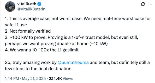 这里需要注意的另一点是,即使在最坏的情况下,也必须努力接近实时。今年 5 月,Vitalik 通过他的 X 账户提到,即使在最坏的情况下,“实时证明”对于安全的 L1 使用也是必要的。