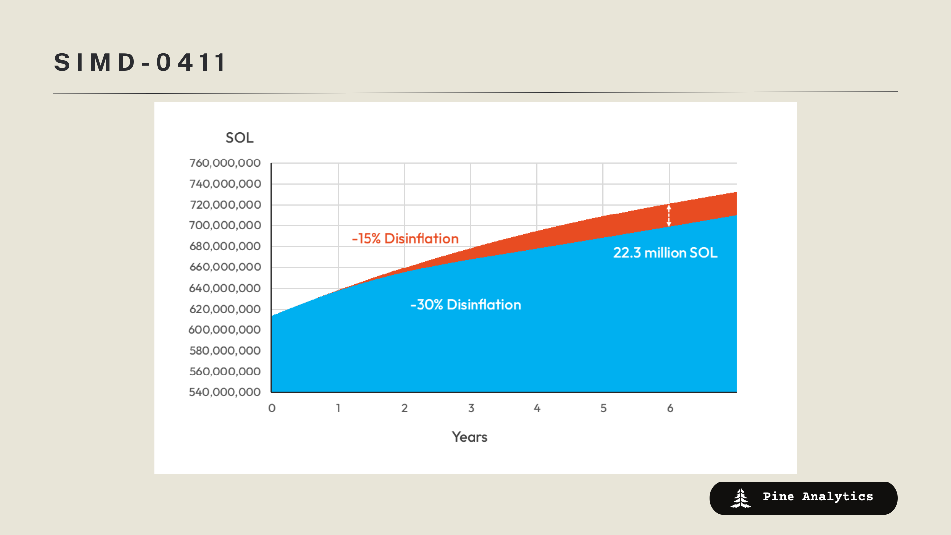 SIMD-0411 追求与 SIMD-0228 相同的核心目标——大幅减少 SOL 排放——但它以一种更简单、风险更低的方式实现。SIMD-0228 引入了一种动态的、对 stake 响应的公式,该公式引起了人们对复杂性、参数调整和不可预测结果的担忧,而 SIMD-0411 仅改变了一个单一的、广为人知的杠杆:它将通缩率从 –15% 加倍到 –30%。这使得效果是确定性的且易于建模,避免了新的边缘情况或实施风险,并且更容易与验证者、staker和机构沟通。简而言之,它在避免导致 SIMD-0228 停滞不前的治理摩擦和不确定性的同时,实现了类似的减排最终状态,所有这些都没有改变 Solana 的最终通货膨胀目标。