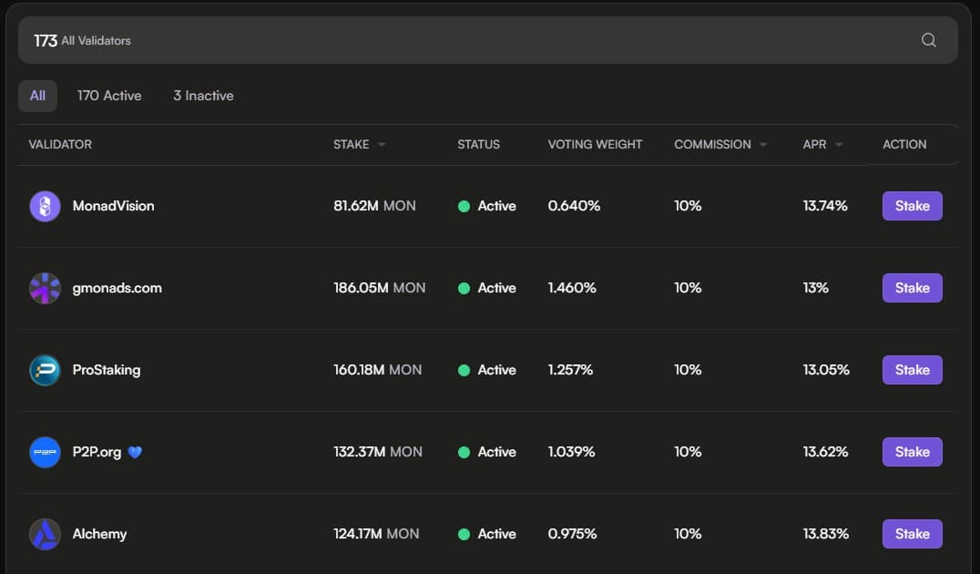 为了你自己的回报,请密切关注 佣金年利率(APR) 列。佣金是验证者从你的奖励中保留的用于支付其硬件成本的“服务费” - Monad 上的标准费率通常为 10%。年利率(APR)为你提供了一个你将获得的收益的估计值,目前根据你选择的节点,该收益在 13%15% 之间。