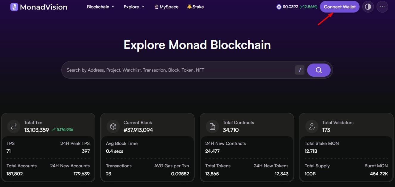 1. 前往 MonadVision,单击平台顶部的 “连接钱包” 并批准你的钱包连接 (PhantomMetaMask 等)。