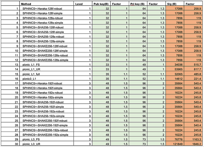 Method Public key size (B) Private key size (B) Signature size (B) Security level