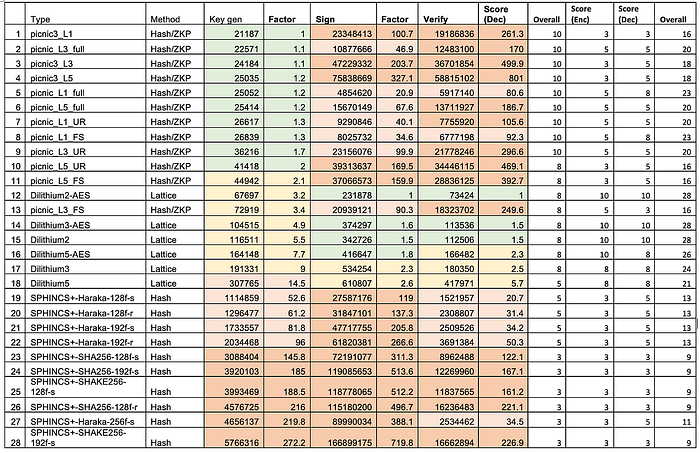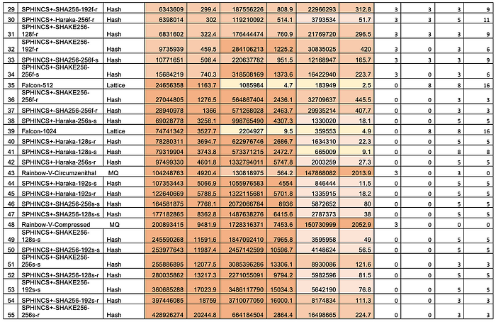 对于 M4 (ARM Cortex-M4 dev) [1] 上的性能,以每秒 CPU 操作次数衡量。请注意,[1] 中未执行 Rainbow 评估,因此 LUOV(一种 Oil-and-Vinegar 方法)已被用于指示性能水平: