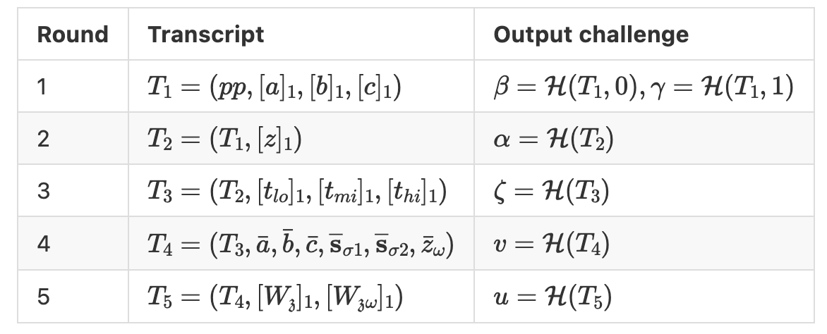 通过使用 Fiat-Shamir 变换,该协议可以变为非交互式的:对于每个交互轮次,非交互式 PLONK 证明者通过哈希到该轮次为止的通信 记录 来自行生成相应的挑战集。到某个轮次为止的记录定义为定义电路的公共参数、定义实例的公共输入以及到该轮次为止由 PLONK 证明者计算的证明元素的串联。本博文中检查的 PLONK 版本 是撰写本文时可用的最新版本(来自 2022 年 8 月 17 日),其中记录和在每一轮计算的相应挑战如下所示: