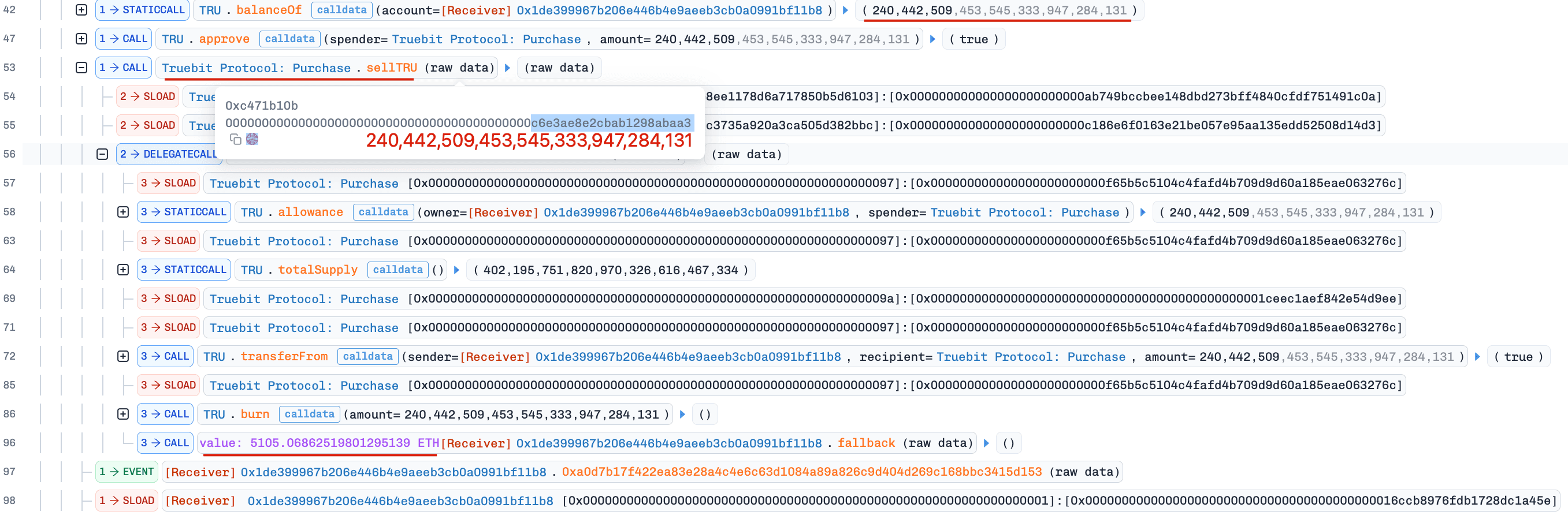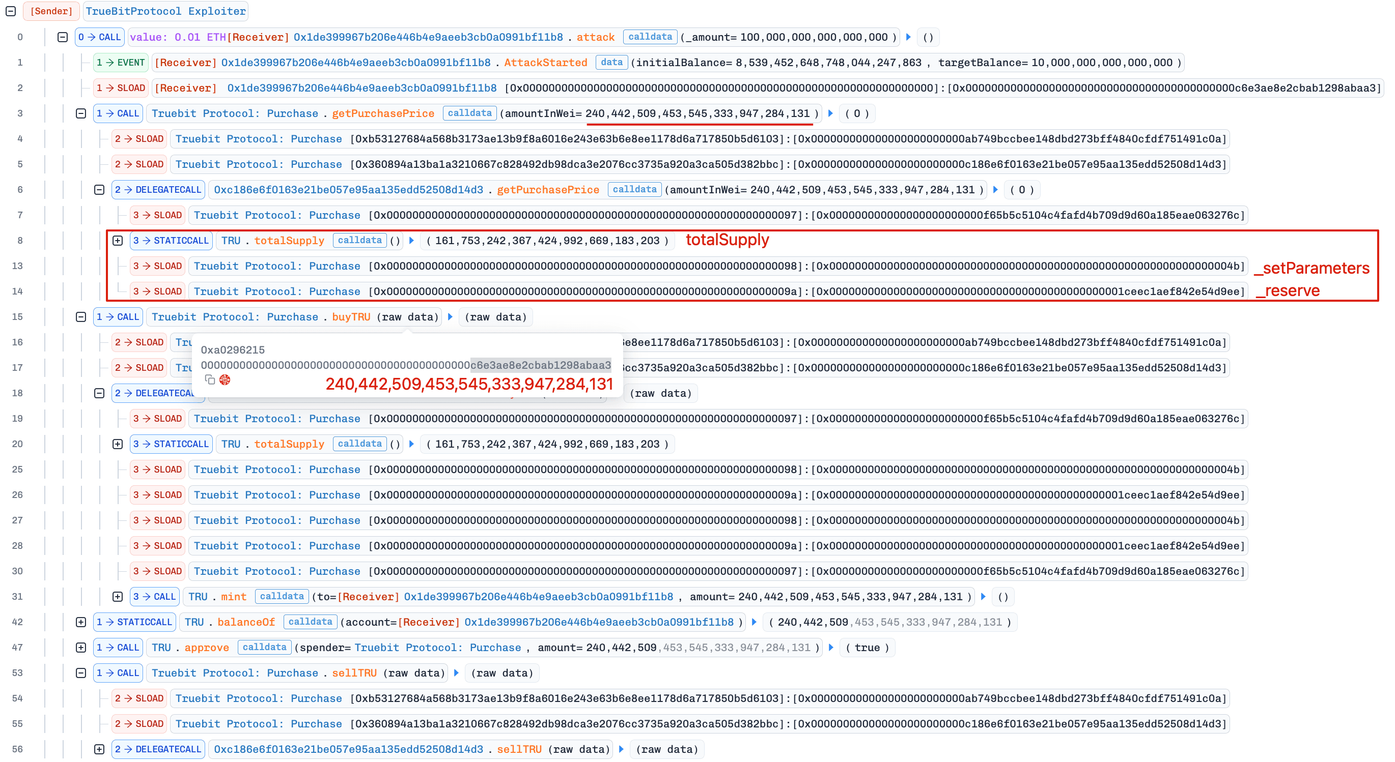 通过提供精心选择的购买金额 (240,442,509.453,545,333,947,284,131),攻击者触发了 _getPurchasePrice() 中的溢出,将计算出的购买价格降低为 0 ETH,并允许以零成本获得约 2.4 亿 TRU。