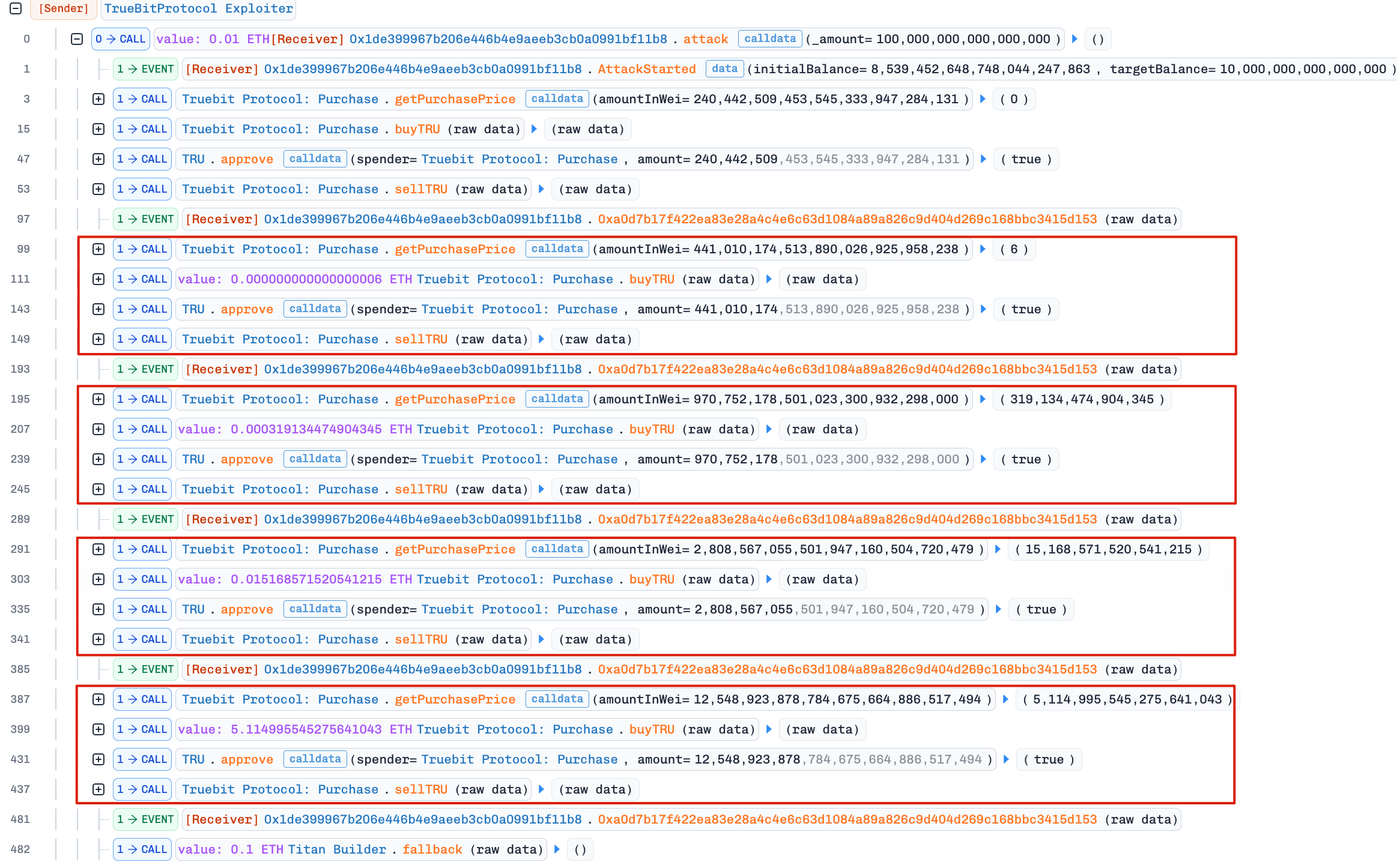 攻击者在单个交易中执行了多轮套利 [3],重复:getPurchasePrice() -> buyTRU() -> sellTRU()