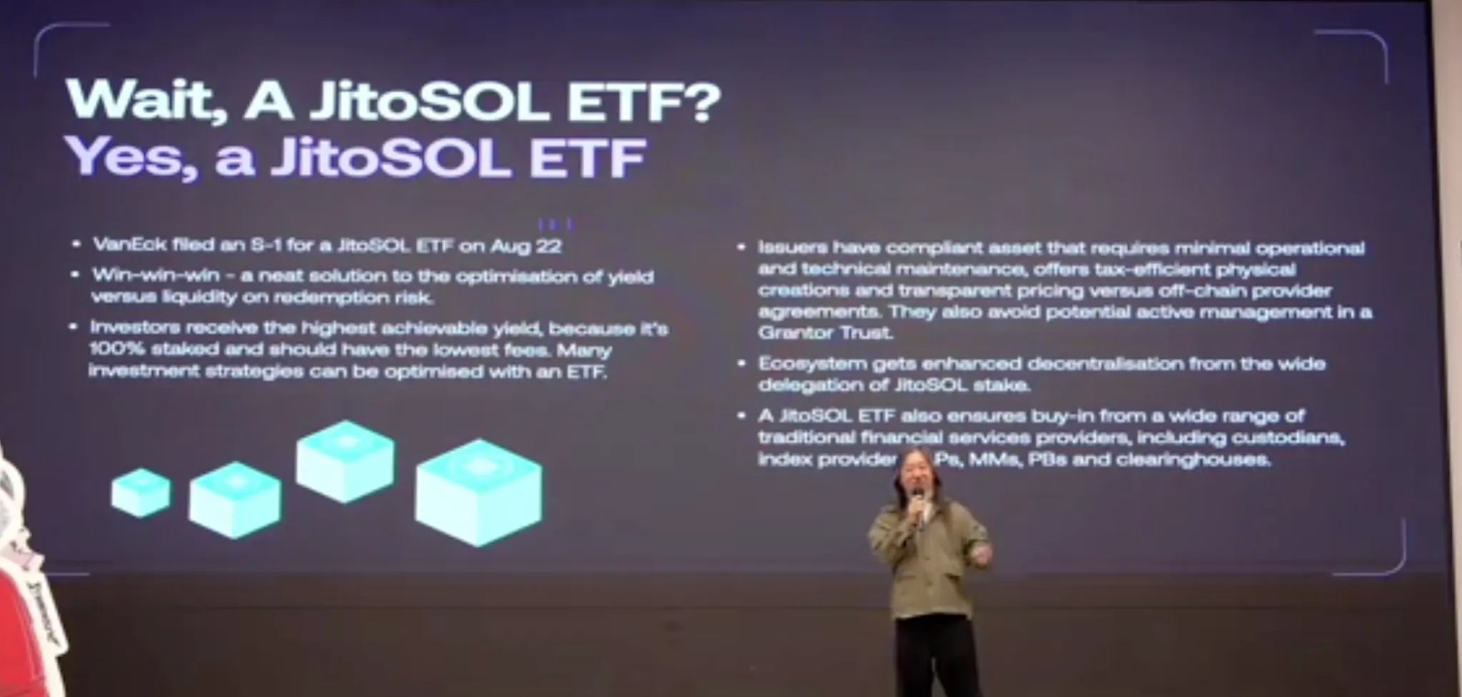 特别值得注意的是,VanEck 于 2025 年 8 月 22 日提交了 JitoSOL ETF 的申请——这是同类首个基于质押的 ETF,而不是实物对现金的 ETF。其设计提供了三重优势:为投资者提高收益并实现即时赎回流动性、为发行人提高运营效率,以及通过更多验证器参与整个 Solana 生态系统来加强去中心化。