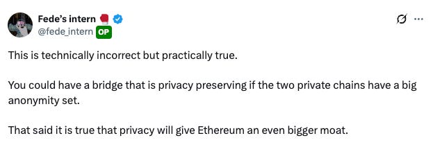 idt privacy as a bolt-on afterthought will ever work at scale so i find it unlikely that we'll get privacy on public chains.\\