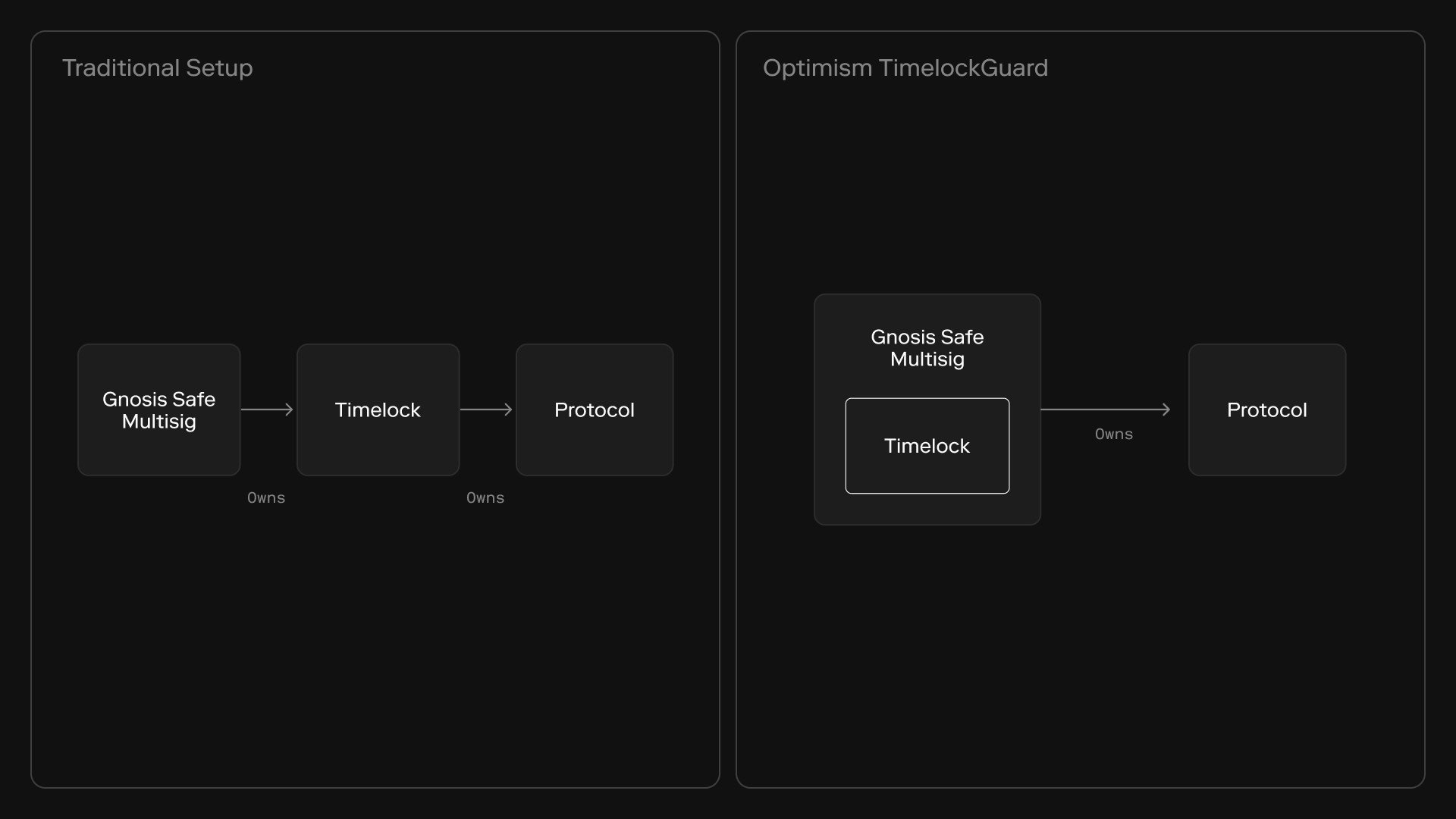 在 Optimism,我们实现了一个时间锁,该时间锁与 Gnosis Safe 紧密集成,并要求对现有的治理过程进行尽可能小的改动。通过重用它所集成的 Safe 中的代码,时间锁变得更加简单和健壮。