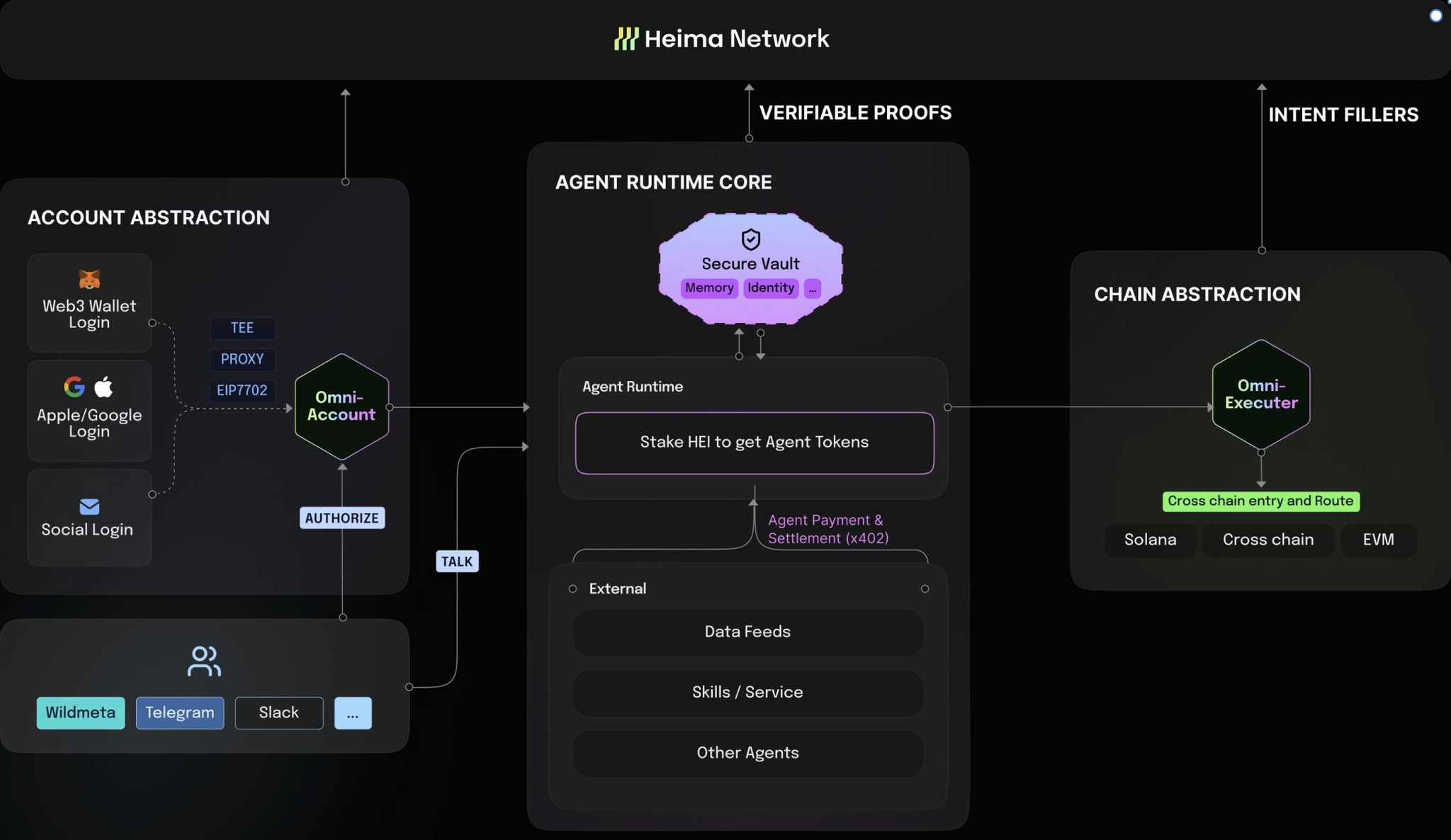 • Heima (@heimaNetwork):通过结合 TEE 和账户抽象(ERC-4337)来确保 x402 支付执行安全。它通过在 TEE 内部生成密钥和签名来保护代理免受密钥被盗,同时通过智能账户可编程钱包实现超越 EOA 限制的灵活支付环境。这包括无 gas 交易、多链支付和标准 ERC-20 代币支持。