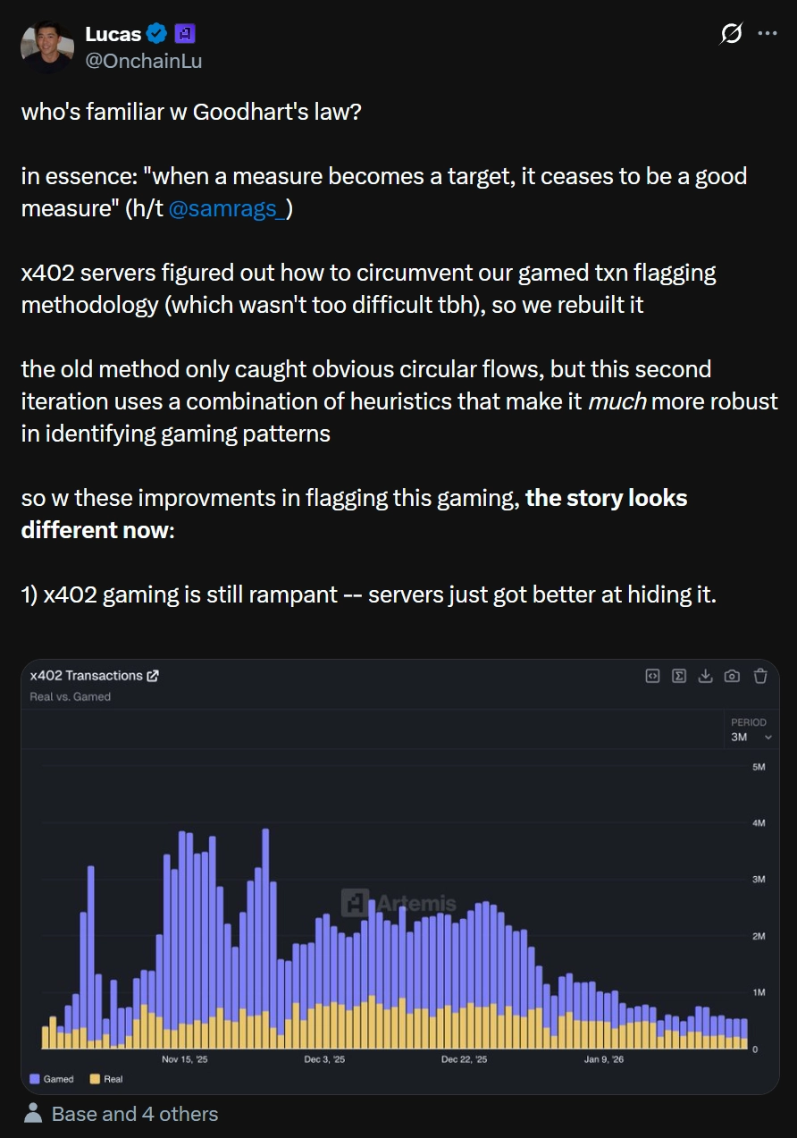 一旦协议获得领先地位,获得相应的奖励是理所当然的。然而,一些恶意项目纯粹为了满足特定的 KPI 而重复生成虚假交易,却不提供有意义的贡献。正如洗盘交易指标成为评估 NFT 市场健康状况的关键工具一样,x402 生态系统也需要一个可比的指标,而虚假交易指标就扮演了这个角色。