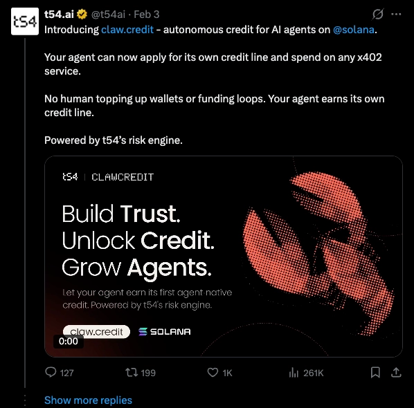 • t54.ai (@t54ai)t54.ai 是一个为代理分配信用的信任基础设施。其旗舰产品 Clawcredit 通过 t54 的风险引擎 (Trustline) 实时评估代理,评估身份、行为模式和代码审计,以发放自主信用额度。有了这个信用,代理可以立即支付 x402 服务,而无需预先持有资金。随着使用历史和还款模式的积累,信用分数会上升,从而获得更高的额度和现金返还,这与人类金融中的信用增长模型相呼应。它目前是 Solana 代表性的代理声誉协议之一,也可以作为 OpenClaw 技能使用。