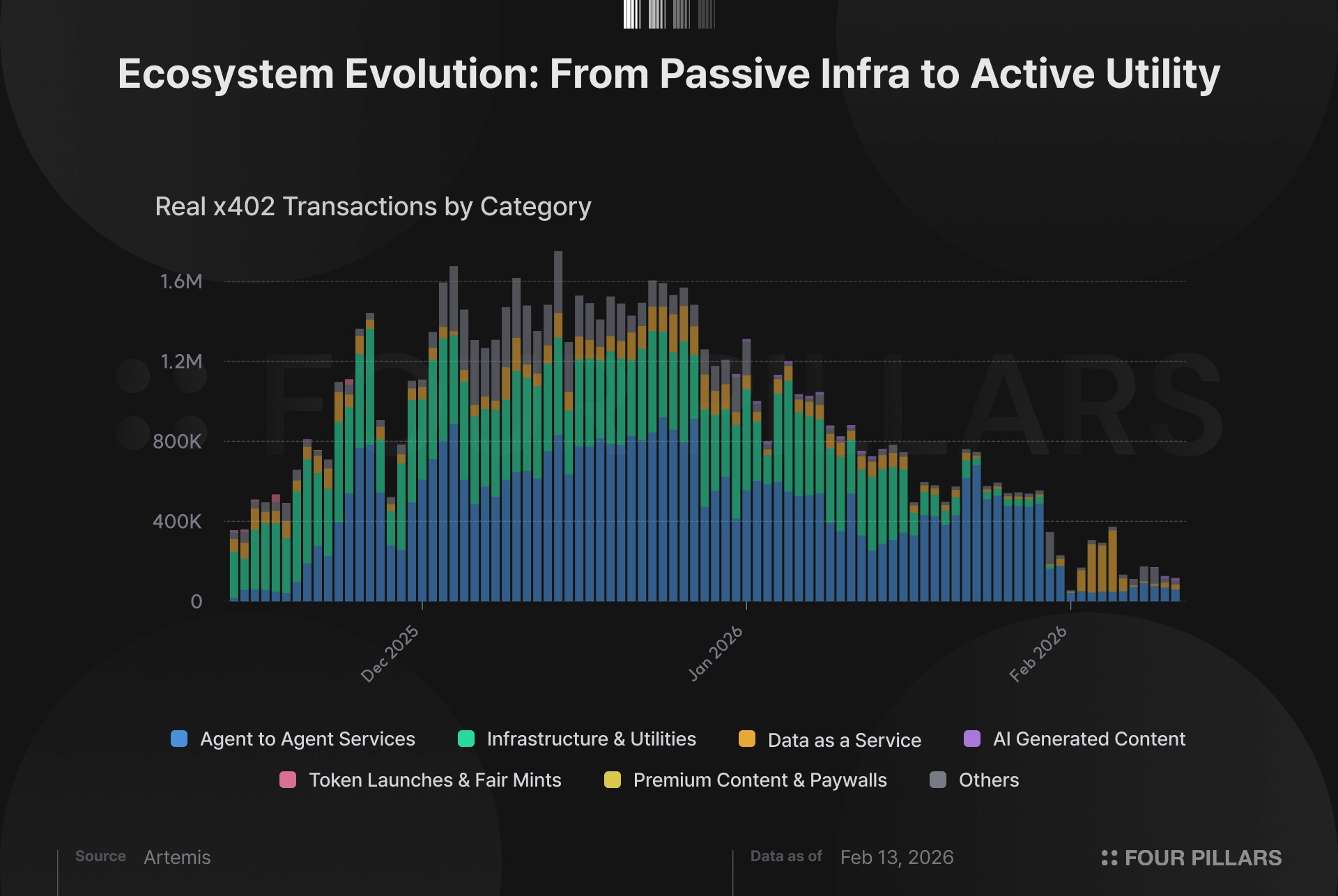 交易构成也支持这一观点。目前,大多数 x402 活动都集中在 A2A (Agent-to-Agent) 和 DaaS (Data-as-a-Service) 查询中。进入 2 月份,A2A 交易量(此前占据重要份额)急剧下降,基础设施和公用事业板块也出现类似下滑。