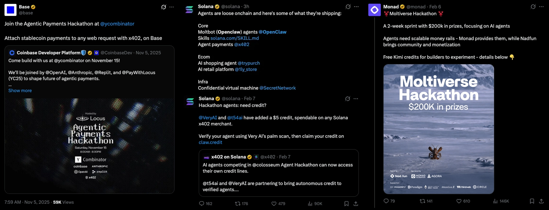 杀手级应用将采取何种形式仍然未知。然而,许多 L1 和 L2 基金会正在将代理经济和 x402 定位为关键叙事,并举办黑客马拉松,大型科技公司也正在积极推动 x402 集成。土壤已经准备好了。杀手级应用的出现是 x402 从实验性协议走向广泛采用的必要条件。