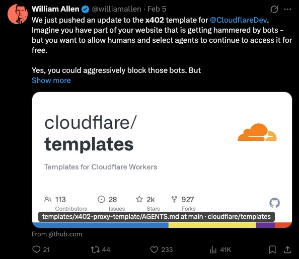 • Cloudflare (@Cloudflare):2025 年 9 月 23 日,Cloudflare 与 Coinbase 共同创立了 x402 基金会,并将其 x402 v2 支付原生嵌入其代理 SDK。当代理部署在 Workers 上时,支付和 MCP 认证会自动应用。Cloudflare 还开源了 x402-proxy-template,允许网站所有者为每次下载或每次 API 调用抓取单元设置基于路由的微支付。