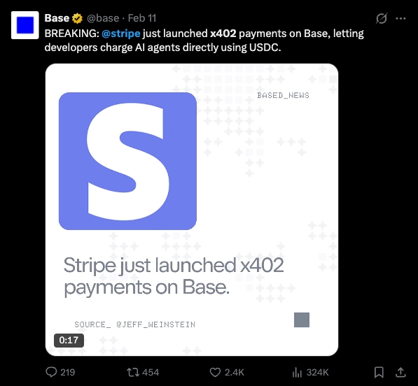 • Stripe (@stripe):2026 年 2 月 11 日,Stripe 通过 PaymentIntents API 正式推出了 Base x402 USDC 支付。当代理在链上支付时,Stripe 会自动将其转换为美元并通过现有仪表板结算。未来的集成,例如 Privy 钱包支持或应用 Tempo 网络,也是可能的。