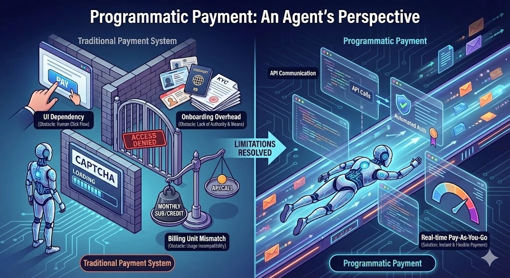 • UI 依赖:传统支付是为了让人类在视觉上确认并点击流程而优化的,这使得整个过程对于通过 API 通信的代理来说成了摩擦。