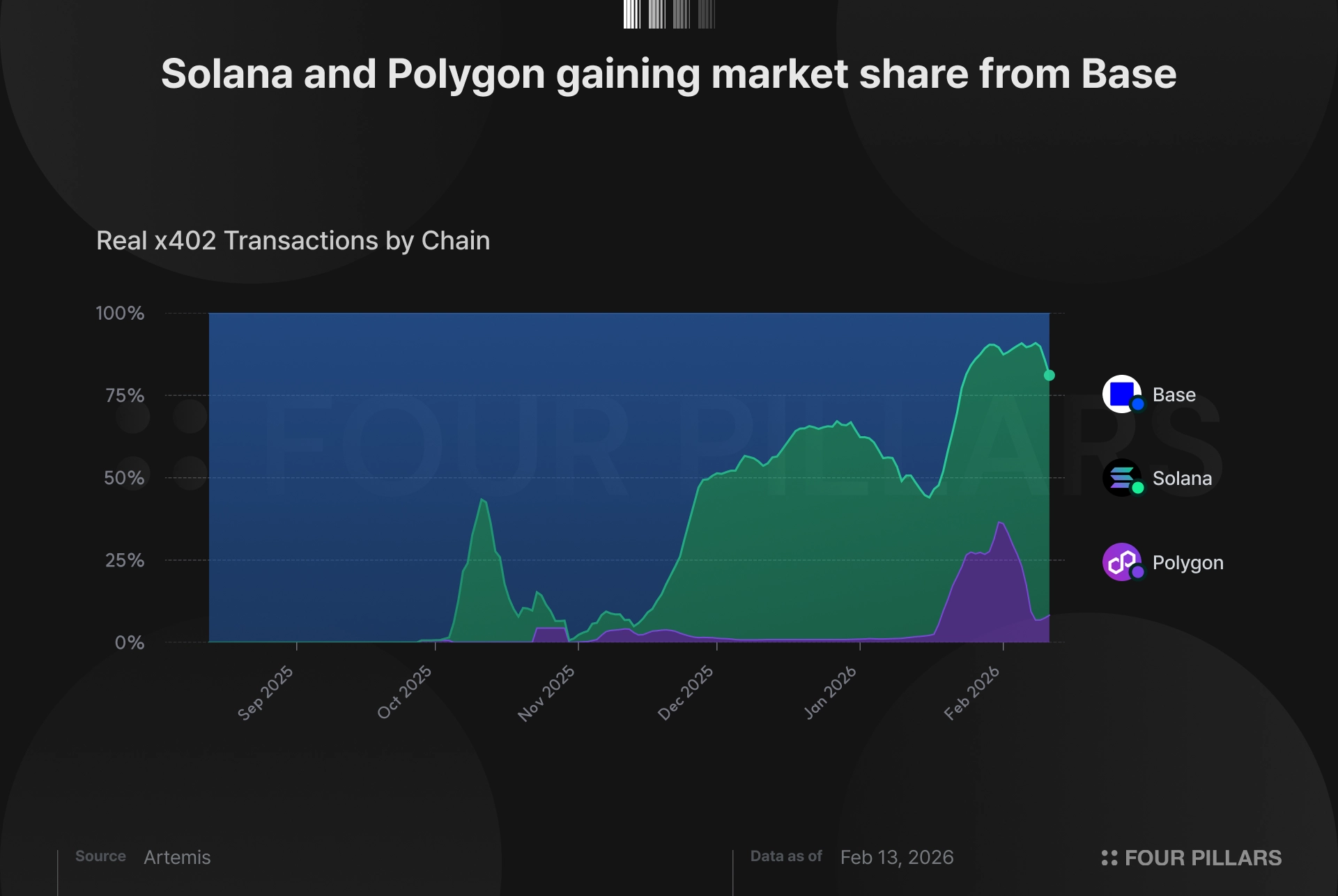 x402 的实际交易链份额也显示出有意义的变化。当 8 月和 9 月实际交易量开始认真观测时,x402 最初实施的链 Base 实际上占据了 100% 的交易,是一个事实上的单链生态系统。10 月份,Solana 加入,多链转型开始。12 月份,Solana 以 61% 对 39% 的份额超越 Base。2026 年 1 月,Polygon 扩展到 11%,形成了三方结构。2 月份,Solana 以 82% 的份额占据主导地位。