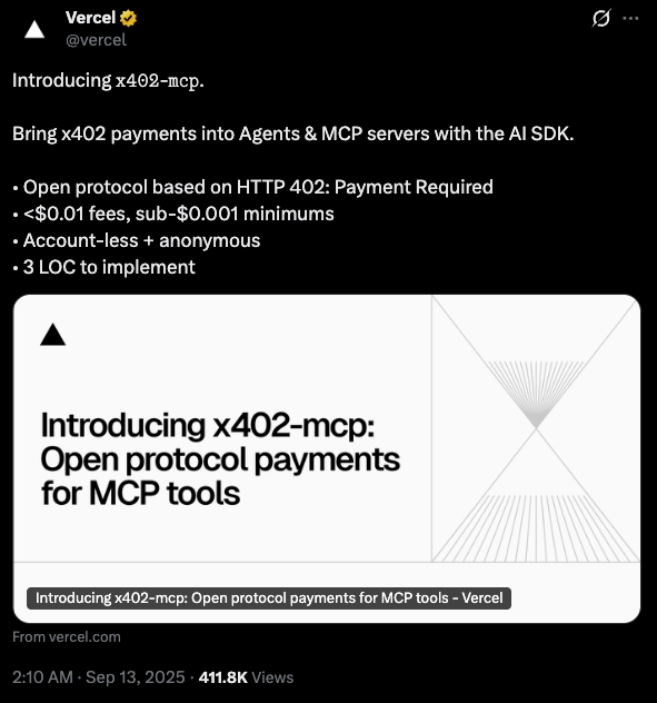 • Vercel (@vercel):2025 年 9 月 13 日,Vercel 宣布推出 x402-mcp 包,将 AI SDK 与 x402 支付集成。如果付费工具在 MCP 服务器上定义,当代理调用该工具时,支付会自动执行。Vercel 还通过一键模板方便地集成了 x402 支付模块。