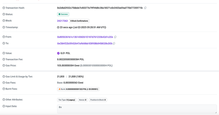 在 MetaMask 钱包设置好并用 POL 原生货币充值后,让我们通过 MetaMask 为其中一个生成的地址充值。(只需复制打印的地址并将其粘贴到 MetaMask 的发送接收人字段中)