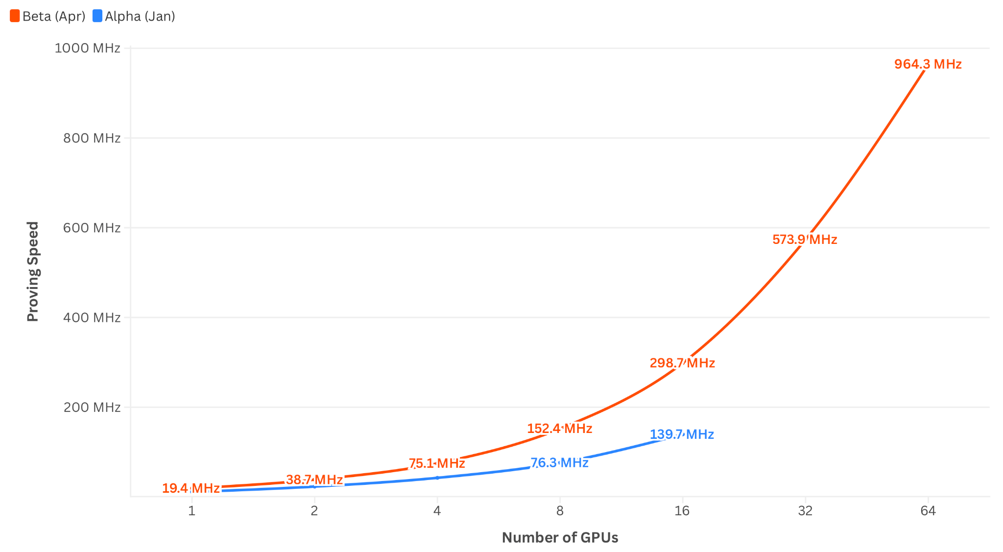 在针对 RV32IM 的行业标准 CoreMark 嵌入式 CPU 基准测试的 适配版本 中,OpenVM 2.0 Beta 在单台 5090 GPU 上的证明速度达到 19.4 MHz,现在在 64 台 GPU 的集群上可扩展至 964 MHz,这代表了比 1 月份发布的 OpenVM 2.0 Alpha 版本约 2 倍的性能提升。